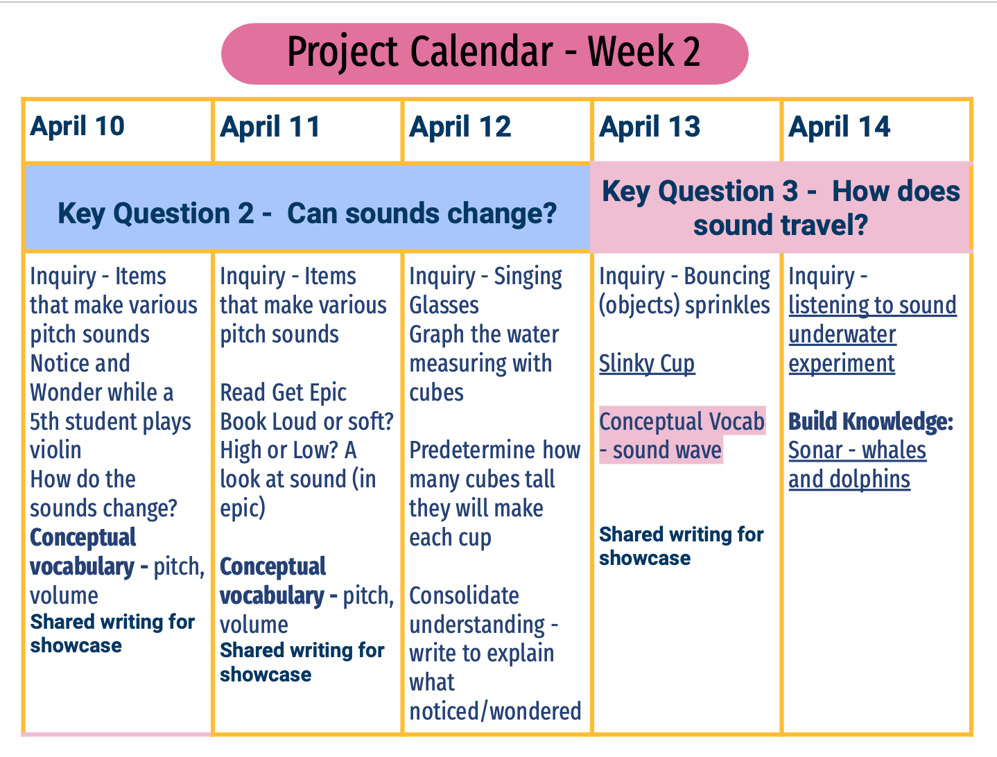 Before introducing the driving question, I took my class on a sound walk to journal the sounds we heard outside. Despite the abundance of sounds in their surroundings—such as the busy noise of the street, the sirens of ambulances heading to the nearby hospital, the voices of preschool students across the fence, and the rumble of buses and deliveries to the district warehouse—students initially lacked an awareness for the sound they were hearing. In response, I revised the entry event and showed the class a "20 mystery sounds" video, prompting them to listen and draw what they heard. This activity proved successful and generated even more sounds that they were aware of in their world. It allowed me to introduce the driving question, "How can we, as scientists, investigate sound and present our knowledge to our community?"