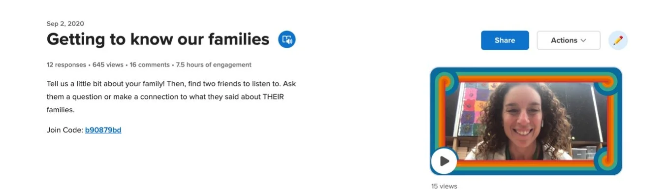 As a part of each students’ website page, children wanted to learn about each other’s families. We used Flipgrid so that children could share family pictures and describe their families and what they liked to do together. We also used this platform to encourage students to ask questions and connect with one another.