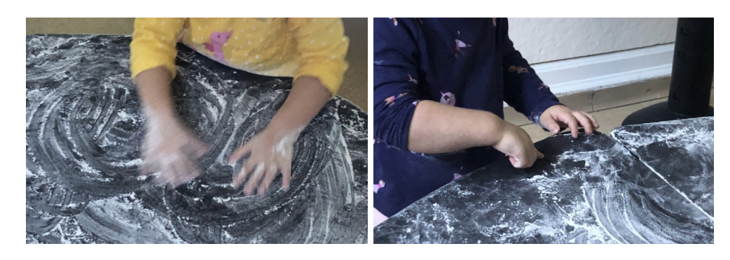 This group continued to prove to me that this project was meaningful by the amount of time they were choosing to remain in each of the activities. I reflected on my original misconceptions of this age group as I continued to collect photos, videos, and language from the project experiences. In one lesson, children moved the flour in circular motions back and forth and drew shapes with their fingers. Children smelled the flour, and called it “snow” and “sugar”. One child wondered, “Could we eat it?”. It felt as though the children were writing the lesson plans for me. Little did they know that cooking a real pizza was in the pipeline.