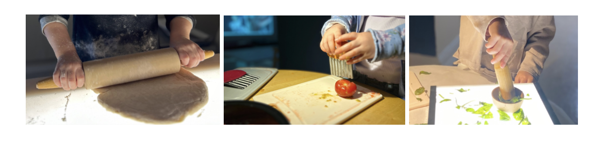 Children explored the real ingredients of pizza. Children explored flour, rolled pizza dough, cut up tomatoes, and used a mortar and pestle to grind basil.