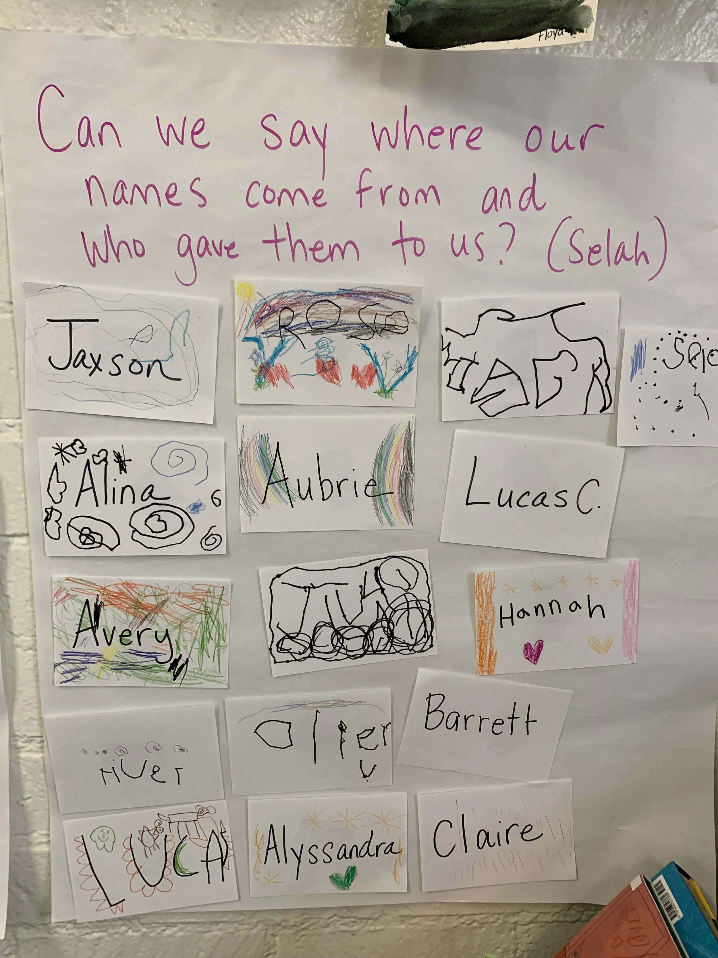 Children begin by exploring their names through playful and meaningful activities—counting and writing the letters, recognizing sounds, and creating name art. They interview family members to learn about the origins, cultural significance, or special stories connected to their names. As they build their understanding, they reflect on what their names mean to them and how they are connected to identity and belonging.